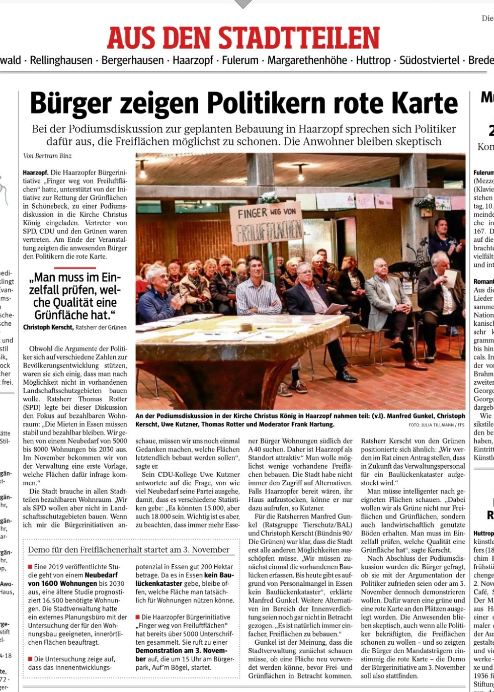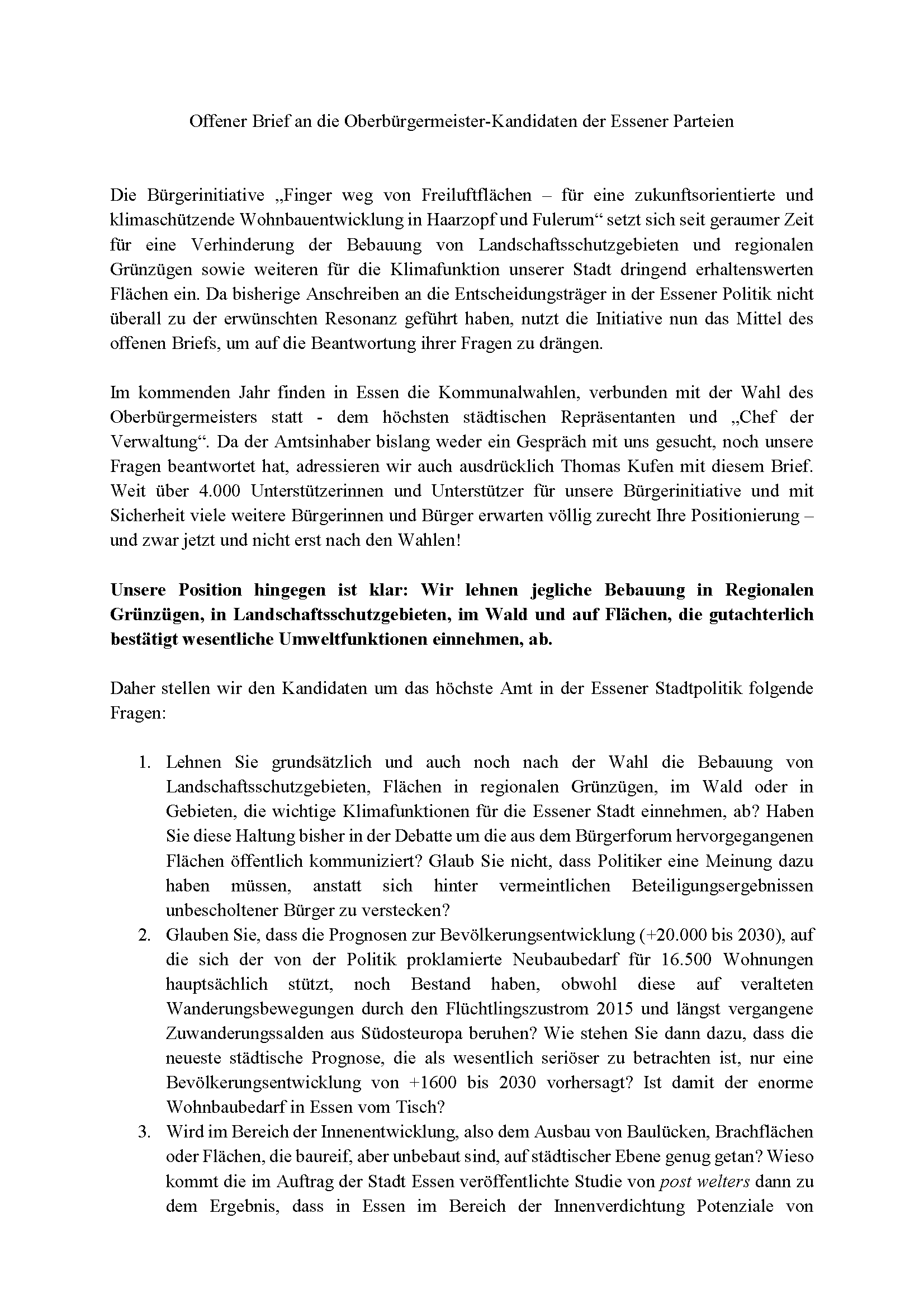 Worüber das Bürgerforum in einer Stunde entscheiden sollte, schafft die Planungsverwaltung nicht in einem Jahr – angekündigte Übergabe der Unterschriftenliste abgesagt, da entgegen langer Ankündigen in der Ausschusssitzung am 7.11. nicht über die Wohnbauflächen beraten wird. Engagierte Bürgerinitiative „Finger weg von Freiluftflächen“ aus Haarzopf/Fulerum und ihre Forderung nach Ausschluss von Landschaftsschutzgebieten wird weiterhin ignoriert, Bürgerinnen und Bürger sind enttäuscht und verärgert über den Oberbürgermeister. Als Bürgerinitiative „Finger weg von Freiluftflächen“ zeigen wir uns enttäuscht über den Umgang mit unserer Forderung, Landschaftsschutzgebiete in Essen nicht für eine Wohnbebauung zu opfern. War in den vergangenen Monaten immer wieder die Rede davon, dass in der Sitzung des Stadtplanungsausschusses Anfang November über die Ergebnisse des sogenannten Bürgerforums berichtet werden soll, so hat unsere öffentlichkeitswirksame Interessenvertretung im Sinne der Essener Bürgerinnen und Bürger lediglich dazu geführt, dass nun der Tagesordnungspunkt nicht mehr für die kommende Sitzung des Ausschusses vorgesehen ist. Bewusst haben wir im Vorfeld dieser Sitzung die Übergabe unserer über 5.000 Unterschriften angekündigt. Da uns das Thema sehr am Herzen liegt und wir eine Diskussion begleiten, die einen Großteil der Essenerinnen und Essener bewegt, haben wir uns nunmehr entschieden, die Übergabe der Unterschriften auf den Zeitpunkt zu vertagen, in dem die Prüfergebnisse der Verwaltung für die einzelnen Flächen tatsächlich vorliegen. Eine Übergabe am 7.11. findet damit nicht mehr statt. Die Brisanz der Diskussion macht es notwendig, die Übergabe in einem angemessenen Rahmen zu ermöglichen. Die von uns gesammelten Unterschriften sind als breites Bürgervotum nicht für den Papierkorb gemacht! Was wir nach wie vor von allen politischen Parteien erwarten, ist ein genereller Beschluss, der den politischen Willen, Landschaftsschutzgebiete dauerhaft zu erhalten, erkennen lässt. Dies ist eine politische Frage, die völlig unabhängig von etwaigen Flächenvorschlägen zu beraten ist. An dieser Stelle möchten wir auch noch einmal ausdrücklich betonen, dass wir uns nicht gegen eine generelle Bebauung stellen. Auch für eine bauliche Entwicklung in unserem eigenen Stadtteil sind wir nach wie vor gesprächsoffen und hier wurden bereits mehrere Vorschläge gemacht. Die vielfach fehlerhaften Ergebnisse des sog. Bürgerforums kommen dabei jedoch nicht in Frage. Daher fordern wir zusätzlich einen Beschluss, der die grundsätzliche Abkehr von diesen Ergebnissen deutlich macht. Bürgerbeteiligung heißt für uns vor allem, die Interessen der Bürgerinnen und Bürger vor Ort wahrzunehmen und mit ihnen in einen konstruktiven Dialog zu treten. Hätte man dies getan, so könnte schon längst eine funktionierende Zusammenarbeit in der Stadtteilentwicklung stattfinden. Wir werden weiterhin alles Notwendige unternehmen, um der unpolitischen Haltung von Teilen der Essener Politik entgegenzutreten. Wenn nun versucht wird, sich des Themas zu entledigen, indem in Hinterzimmern Einfluss auf die Verwaltung genommen wird, dann ist dieses taktische Manöver weniger als ein Jahr vor der Kommunalwahl durchaus ersichtlich. Eine öffentlich sichtbare politische Entscheidung kann so zwar verhindert werden, es stellt jedoch die öffentlichen Bürgererwartungen keinesfalls zufrieden. Wenn vor allem der Oberbürgermeister und seine Partei trotz mehrfacher öffentlicher Ansprache bis heute keine Haltung zu dem Thema einnehmen wollen, sehen wir uns gestärkt, weiterhin den nötigen Protest auszuüben. Die Politik darf sich sicher sein: wenn wesentliche Interessen einer breiten Bürgerschaft zugunsten von Partikularinteressen einer kleinen Gruppe von Bodenspekulanten weiterhin ignoriert werden, werden wir bis zur Kommunalwahl im kommenden Jahr für die nötige Transparenz und Politisierung sorgen. Dr. Jörn Benzinger für die BI „Finger weg von Freiluftflächen“ am Essen, 5. November 2019