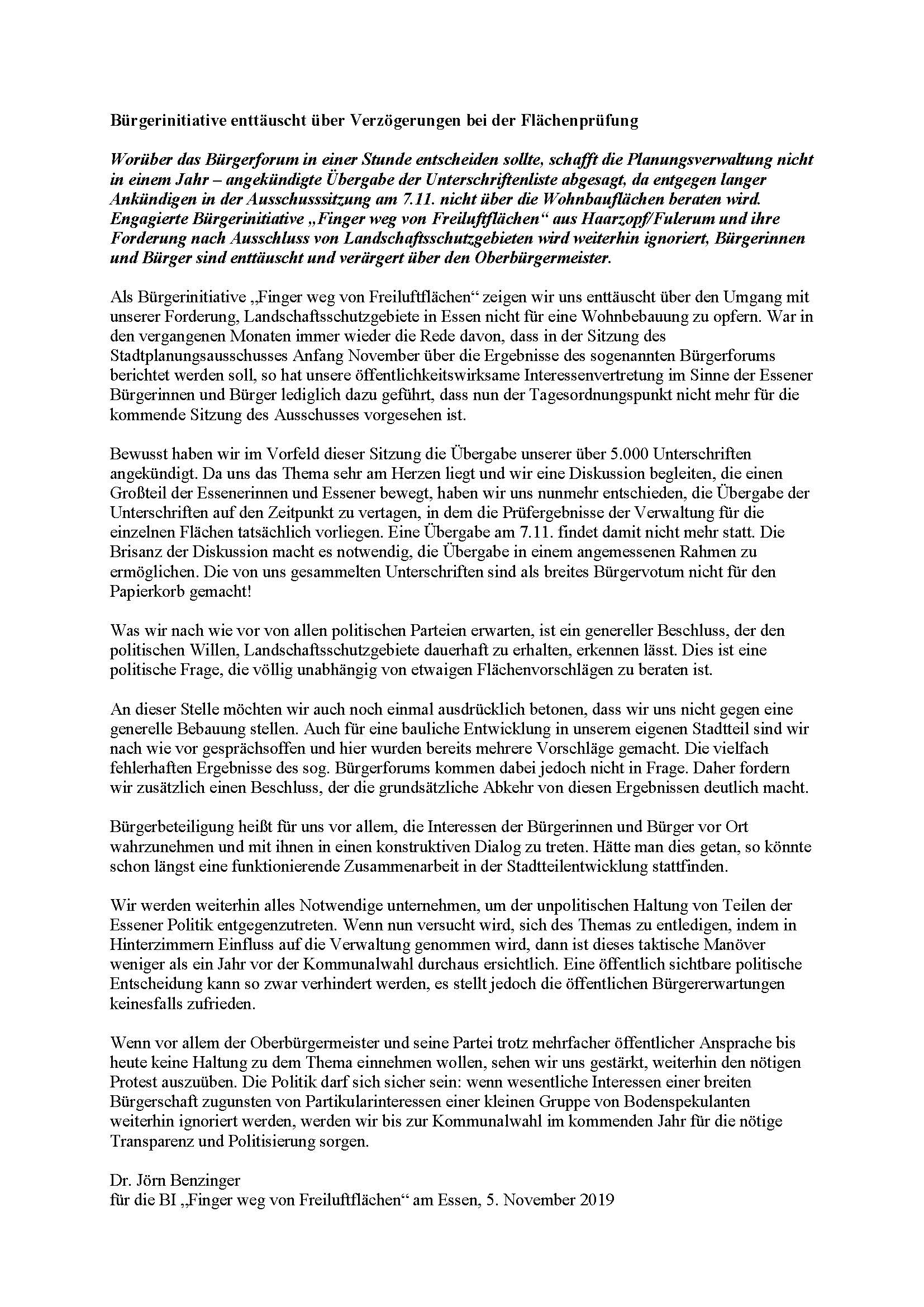Worüber das Bürgerforum in einer Stunde entscheiden sollte, schafft die Planungsverwaltung nicht in einem Jahr – angekündigte Übergabe der Unterschriftenliste abgesagt, da entgegen langer Ankündigen in der Ausschusssitzung am 7.11. nicht über die Wohnbauflächen beraten wird. Engagierte Bürgerinitiative „Finger weg von Freiluftflächen“ aus Haarzopf/Fulerum und ihre Forderung nach Ausschluss von Landschaftsschutzgebieten wird weiterhin ignoriert, Bürgerinnen und Bürger sind enttäuscht und verärgert über den Oberbürgermeister. Als Bürgerinitiative „Finger weg von Freiluftflächen“ zeigen wir uns enttäuscht über den Umgang mit unserer Forderung, Landschaftsschutzgebiete in Essen nicht für eine Wohnbebauung zu opfern. War in den vergangenen Monaten immer wieder die Rede davon, dass in der Sitzung des Stadtplanungsausschusses Anfang November über die Ergebnisse des sogenannten Bürgerforums berichtet werden soll, so hat unsere öffentlichkeitswirksame Interessenvertretung im Sinne der Essener Bürgerinnen und Bürger lediglich dazu geführt, dass nun der Tagesordnungspunkt nicht mehr für die kommende Sitzung des Ausschusses vorgesehen ist. Bewusst haben wir im Vorfeld dieser Sitzung die Übergabe unserer über 5.000 Unterschriften angekündigt. Da uns das Thema sehr am Herzen liegt und wir eine Diskussion begleiten, die einen Großteil der Essenerinnen und Essener bewegt, haben wir uns nunmehr entschieden, die Übergabe der Unterschriften auf den Zeitpunkt zu vertagen, in dem die Prüfergebnisse der Verwaltung für die einzelnen Flächen tatsächlich vorliegen. Eine Übergabe am 7.11. findet damit nicht mehr statt. Die Brisanz der Diskussion macht es notwendig, die Übergabe in einem angemessenen Rahmen zu ermöglichen. Die von uns gesammelten Unterschriften sind als breites Bürgervotum nicht für den Papierkorb gemacht! Was wir nach wie vor von allen politischen Parteien erwarten, ist ein genereller Beschluss, der den politischen Willen, Landschaftsschutzgebiete dauerhaft zu erhalten, erkennen lässt. Dies ist eine politische Frage, die völlig unabhängig von etwaigen Flächenvorschlägen zu beraten ist. An dieser Stelle möchten wir auch noch einmal ausdrücklich betonen, dass wir uns nicht gegen eine generelle Bebauung stellen. Auch für eine bauliche Entwicklung in unserem eigenen Stadtteil sind wir nach wie vor gesprächsoffen und hier wurden bereits mehrere Vorschläge gemacht. Die vielfach fehlerhaften Ergebnisse des sog. Bürgerforums kommen dabei jedoch nicht in Frage. Daher fordern wir zusätzlich einen Beschluss, der die grundsätzliche Abkehr von diesen Ergebnissen deutlich macht. Bürgerbeteiligung heißt für uns vor allem, die Interessen der Bürgerinnen und Bürger vor Ort wahrzunehmen und mit ihnen in einen konstruktiven Dialog zu treten. Hätte man dies getan, so könnte schon längst eine funktionierende Zusammenarbeit in der Stadtteilentwicklung stattfinden. Wir werden weiterhin alles Notwendige unternehmen, um der unpolitischen Haltung von Teilen der Essener Politik entgegenzutreten. Wenn nun versucht wird, sich des Themas zu entledigen, indem in Hinterzimmern Einfluss auf die Verwaltung genommen wird, dann ist dieses taktische Manöver weniger als ein Jahr vor der Kommunalwahl durchaus ersichtlich. Eine öffentlich sichtbare politische Entscheidung kann so zwar verhindert werden, es stellt jedoch die öffentlichen Bürgererwartungen keinesfalls zufrieden. Wenn vor allem der Oberbürgermeister und seine Partei trotz mehrfacher öffentlicher Ansprache bis heute keine Haltung zu dem Thema einnehmen wollen, sehen wir uns gestärkt, weiterhin den nötigen Protest auszuüben. Die Politik darf sich sicher sein: wenn wesentliche Interessen einer breiten Bürgerschaft zugunsten von Partikularinteressen einer kleinen Gruppe von Bodenspekulanten weiterhin ignoriert werden, werden wir bis zur Kommunalwahl im kommenden Jahr für die nötige Transparenz und Politisierung sorgen. Dr. Jörn Benzinger für die BI „Finger weg von Freiluftflächen“ am Essen, 5. November 2019